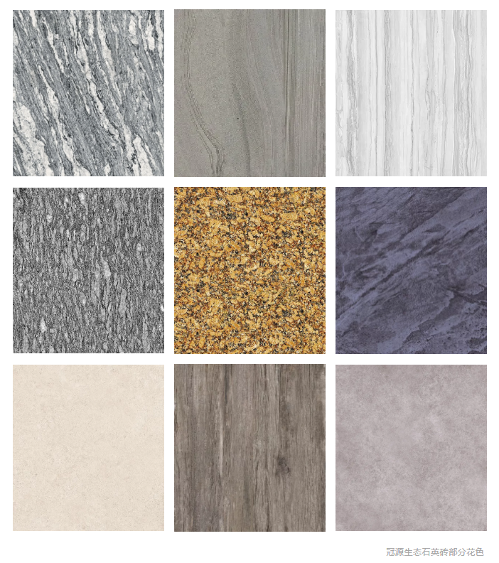 冠源生態石英磚一經亮相便驚艷市場,憑借著豐富多樣的花色和時尚大氣的質感,與傳統瓷磚的廉價感形成鮮明的對比,讓人感受新穎、別具一格。