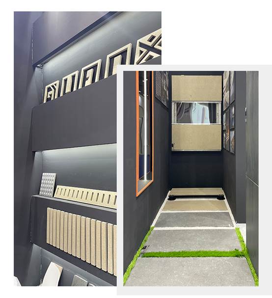 展廳地面不僅呈現了生態石英磚的鋪貼方式,還讓產品肌理與植物、與鵝卵石還原了真實的花園庭院環境,讓大家能身臨其境,打破固有束縛,塑造富有自然氣息的生態感,實現了人與空間的多維互動。展館空間的整體美感離不開每一處構造與產品的完美結合,靈動唯美的最全花色樣磚如畫作般展示于墻上,從正面到側面到背面,讓現場參觀者全方位了解“30mm厚磚新時代”。