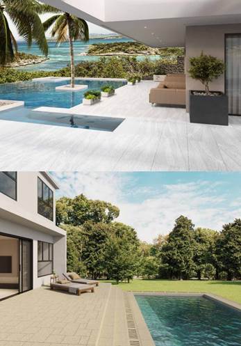 以生態石英磚高端花色打造“泳池磚”絕美體驗,搭配沙灘躺椅、遮陽傘、扶梯等泳池經常出現的物件,疊加景觀樹、鏡子、墊子等一系列概念性道具和元素,增強游泳池的時尚概念,引領高端酒店泳池打造、戶外建筑裝飾風潮!